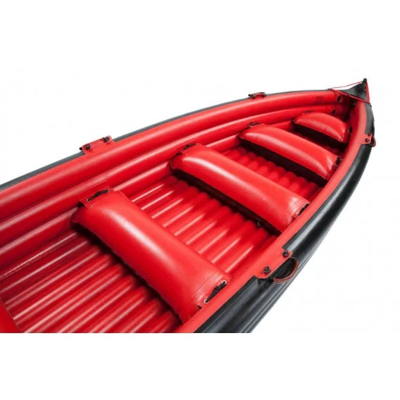 6 mit Gurten fixierte Luftsitzrollen halten das Boot leicht, bieten insgesamt 10 Personen Platz und geben dem Boot zusÀtzlich Festigkeit, wenn es mal durchs leichte Wildwasser geht.